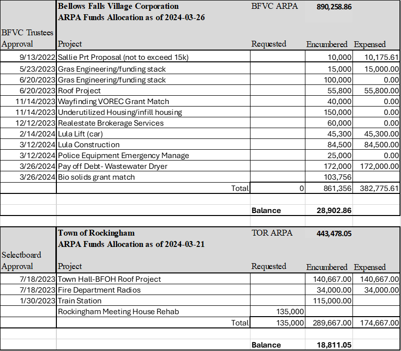 · Ultimate decision of ARPA spending decided by Bellows Falls Village Trustees, Rockingham Select Board and Saxtons River Village Trustees