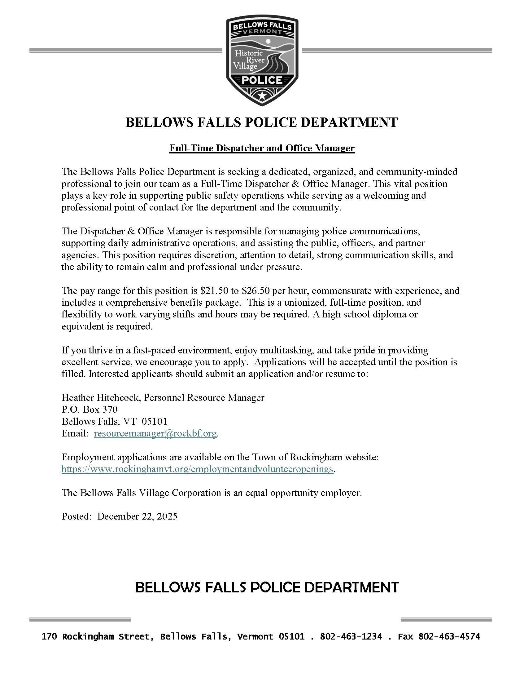 Apply to: Heather Hitchcock, Personnel Resource Manager, P.O. Box 370, Bellows Falls, VT 05101. Applications are accepted until the position is filled.